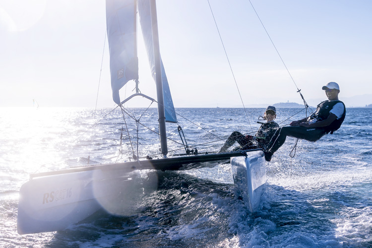 RSCAT16はRSシリーズ初となるカタマランです。シンプルで取り扱いが簡単、耐久性の高いRS CAT16はクラブの仲間や家族とのセーリングに最適です。ハルのバウとスターンが接水していないのでタックの回転は普通のカタマランよりも早く操船がし易くなっており、モノハルセーラーの中でも人気です。レーシングボートの性能を持ちながらもレジャー性が高く、より多くの人がセーリングを楽しめるディンギーです。