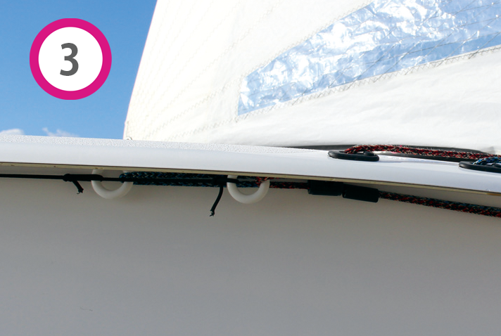 ラフ周り。メインセールは外付けのマストグループにラフロープを通すハリヤード式。メインハリヤード用のラフポケットは非常に便利!カニンガムも、トリムゲージ付き。